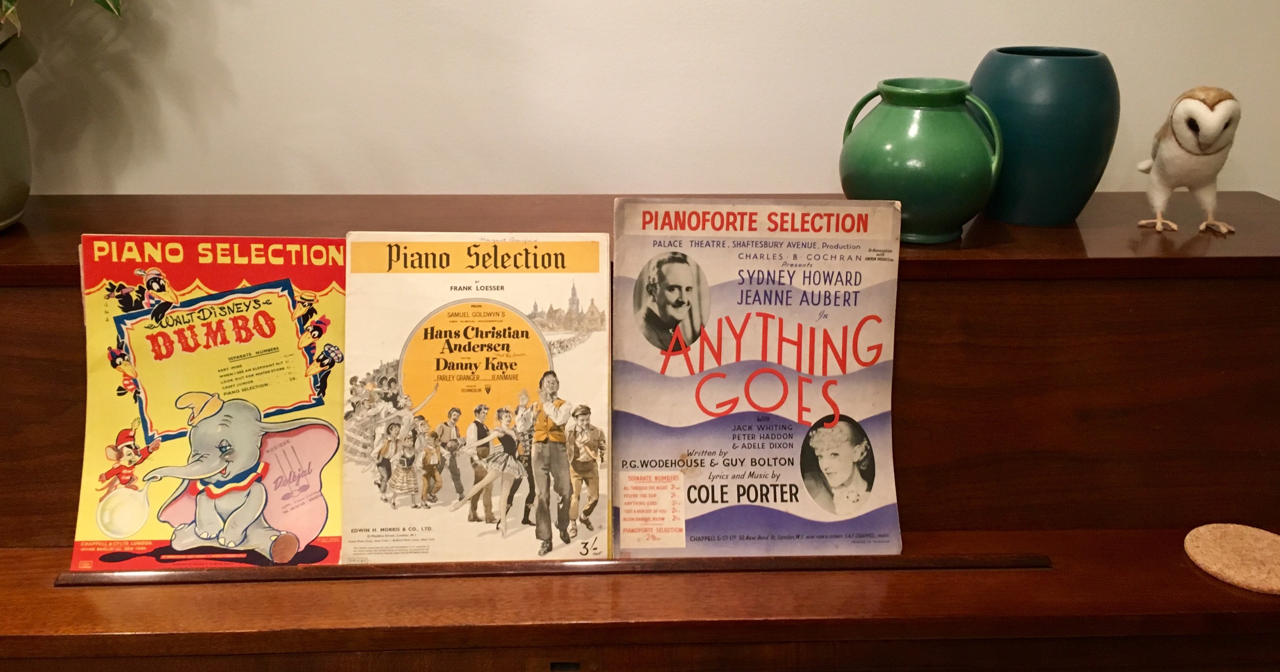 Meanwhile, I have hours and hours of music to enjoy. Come on over! – the piano’s in tune (usually). Maybe the best arrangement of all is Guys & Dolls; certainly Hello, Dolly! is the most fun, and the Disney ones make their own magic. It’s pleasant to hearken back to a simpler time when the music industry put their trust in home piano players, and when my Dad worked over a music store…