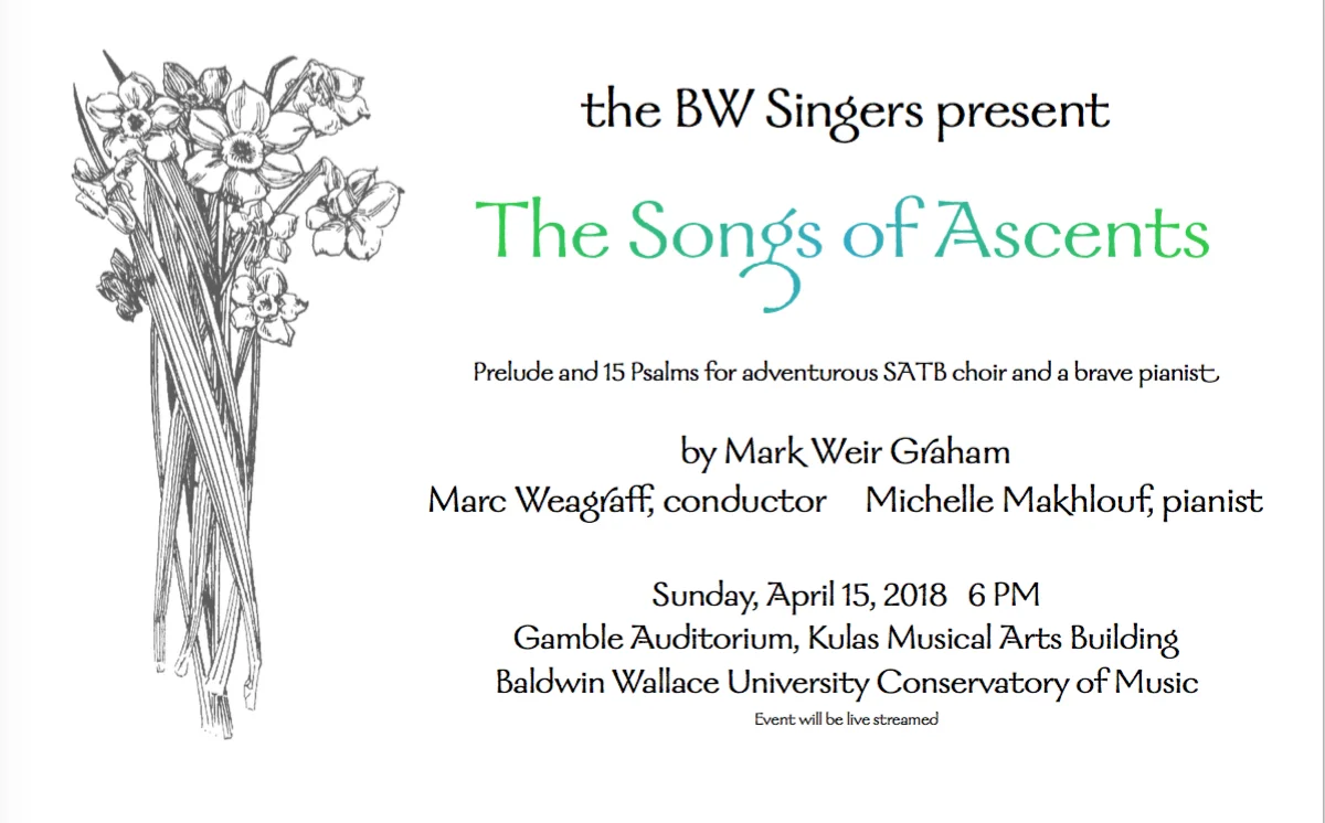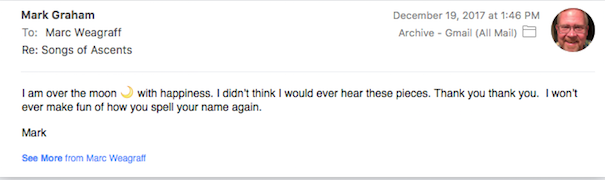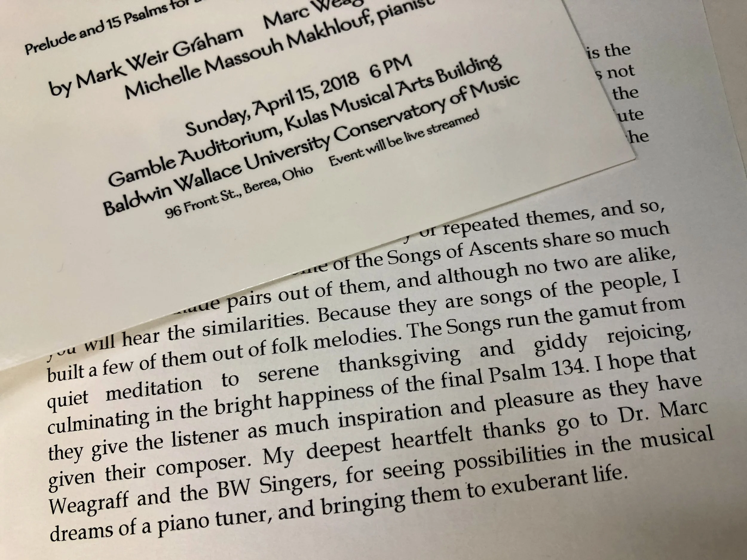 I got two responses. One was from Dr. John Drotleff, who directs the West Shore Chorale here. He gave me some concrete suggestions, and plenty of positive encouragement. The pieces are quite difficult, and are really only suited for ensembles that have ample training and rehearsal time. And then, in December 2017 I got this email from Dr. Marc Weagraff at Baldwin Wallace University Conservatory of Music, my own figurative back yard.